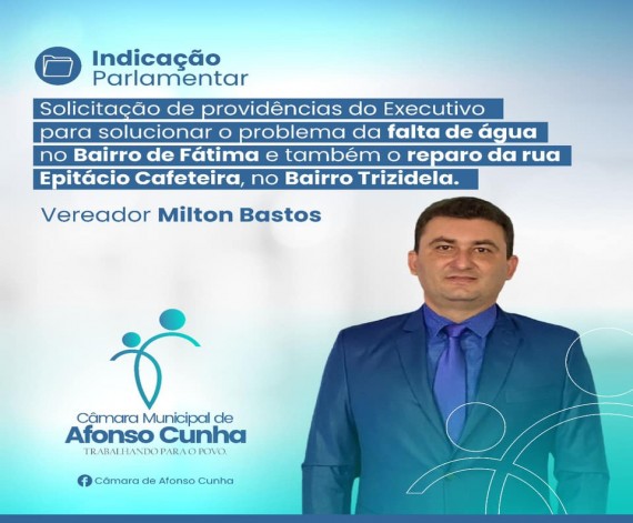 O vereador-presidente Milton Bastos - PDT, apresentou o Requerimento 004/2021, na sessão da última sexta (19), para que fosse solicitado do Executivo, as providências para solucionar com urgência o problema da falta de água no Bairro de Fátima e solicitou o reparo da rua Epitácio Cafeteira.